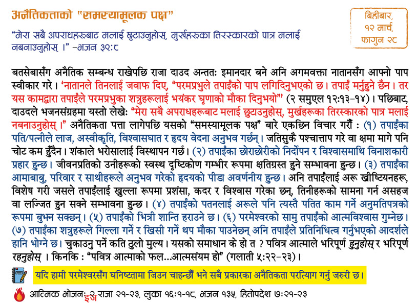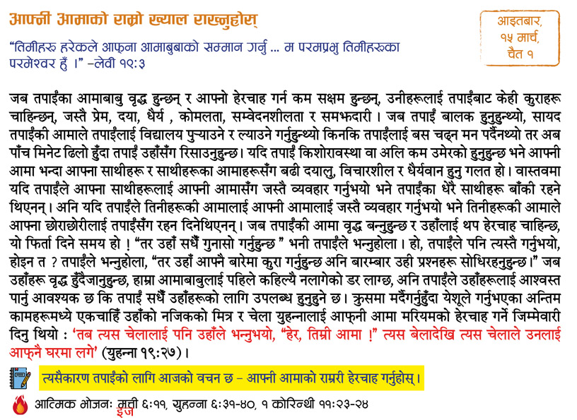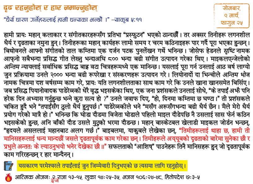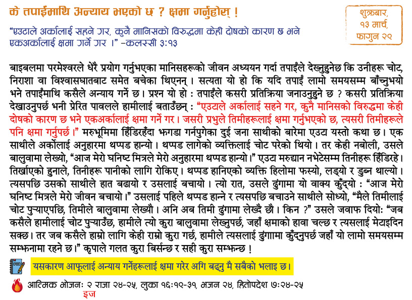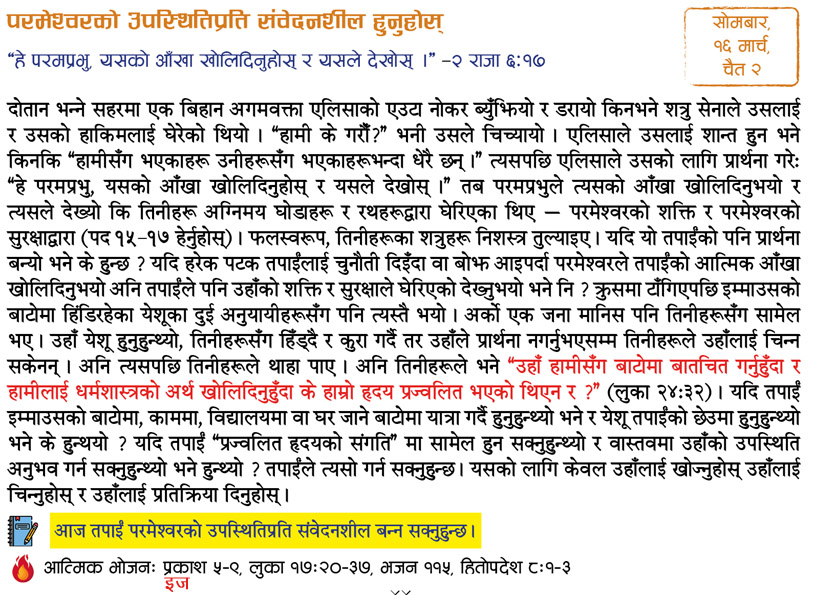 I have been very blessed by the devotional booklet Aajako Bachan, published by MOHN! First of all, I want to thank God that he brought me in contact with MOHN through the devotional. The living Word presented by the booklet daily has inspired me. The Word of God is vital to our life, as Matthew 4:4 says. His Word is everything for me, because as John 1:1 says Word is God. This devotional presents a short, sweet and effective message daily based on a particular topic, which helps me in living a righteous life in God. I am fully convinced that all these things are made possible by your labor, complete dedication and the blessing of God. Also, the devotional presents the life testimonies of great men and women of God as well as comments on various burning issues which make it interesting to read and listen to. I also get to know about how our daily walk with God with should be and how we should live a balanced life in intimacy with and obedience to him.